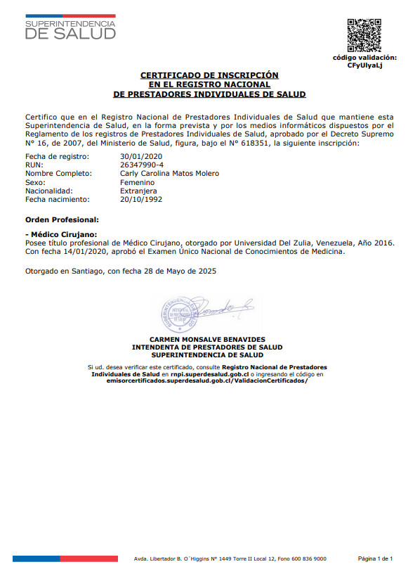 Médico cirujana con reconocimiento de título y Eunacom homologado en chile, especialista en gerencia en salud y concurrente de psiquiatría con más de 9 años de experiencia en atención en el ámbito de urgencias, hospitalización, consulta externa, orientación médica telefónica, atención domiciliaria y traslados asistenciales; capacitada para seguimiento, diagnóstico y tratamiento de pacientes de todos los grupos etarios, ejerciendo con profesionalismo y atención humanista.